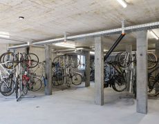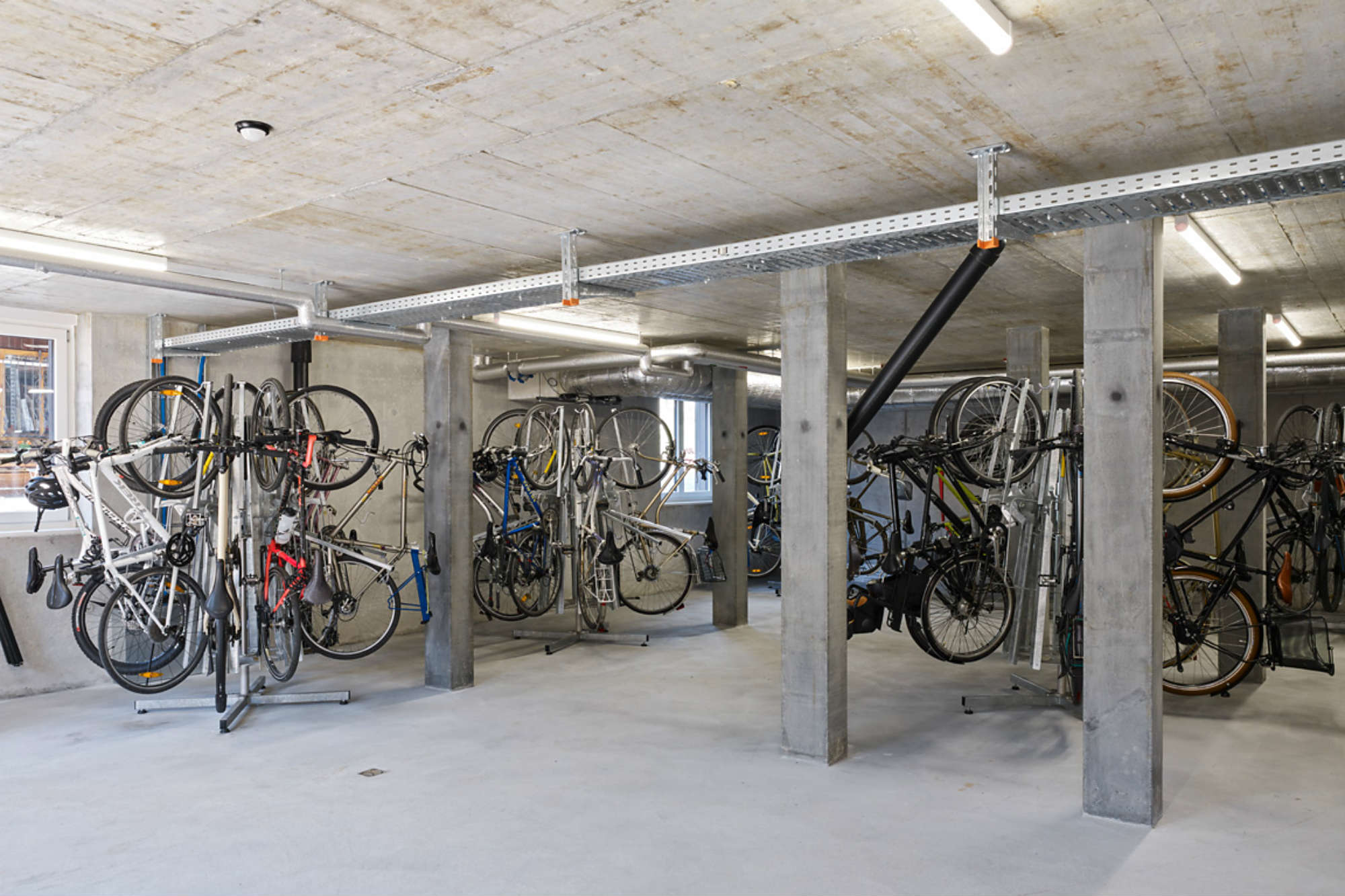 - Allgemein verfügbare gedeckte Veloparkplätze, die ebenerdig im Gebäude